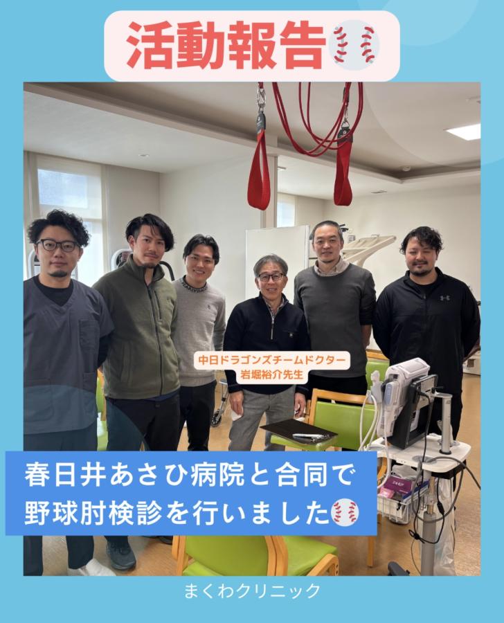 今回は、普段からお世話になっている春日井整形あさひ病院で、中日チームドクターの岩堀裕介先生と合同で野球肘検診を行いました。まくわクリニックからは金田卓也医師と理学療法士2名が参加しました。 超音波(エコー)評価だけでなく、 身体の使い方・柔軟性・セルフケアまで含めた検診を行い、 「ケガを見つける」だけでなく これからも野球を続けるためのサポートを大切にしています。 子どもたちが安心して全力でプレーできるよう、 今後も医師・理学療法士が連携し、地域スポーツを支えていきます。