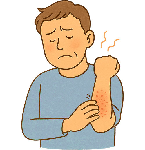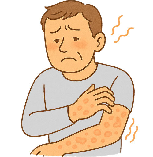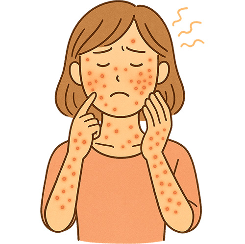 赤く盛り上がった膨疹が急に現れて消え、また別の部位に出現することを繰り返します。